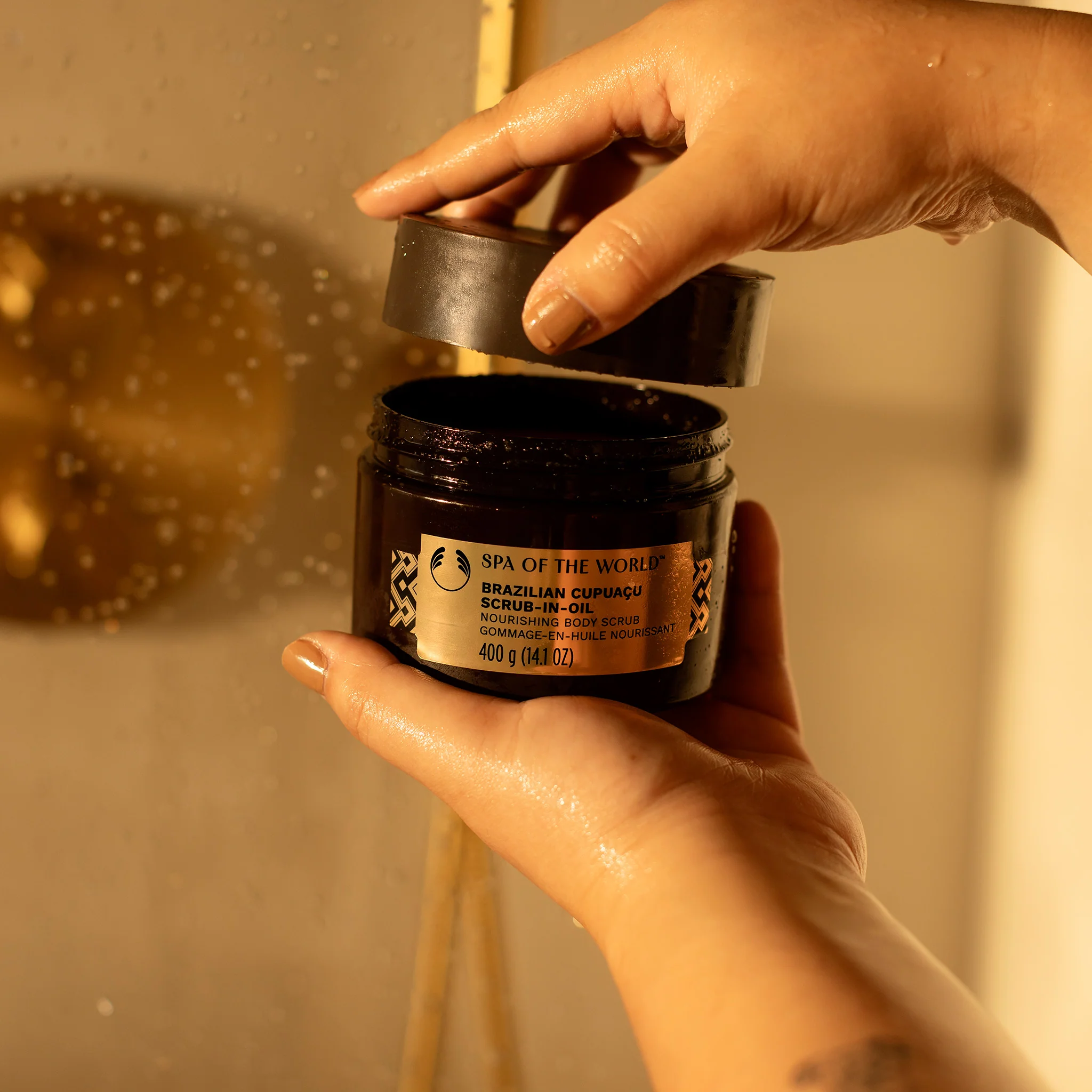 Buff skin smooth with our indulgent Scrub-in-Oil, enriched with cupuaçu butter.